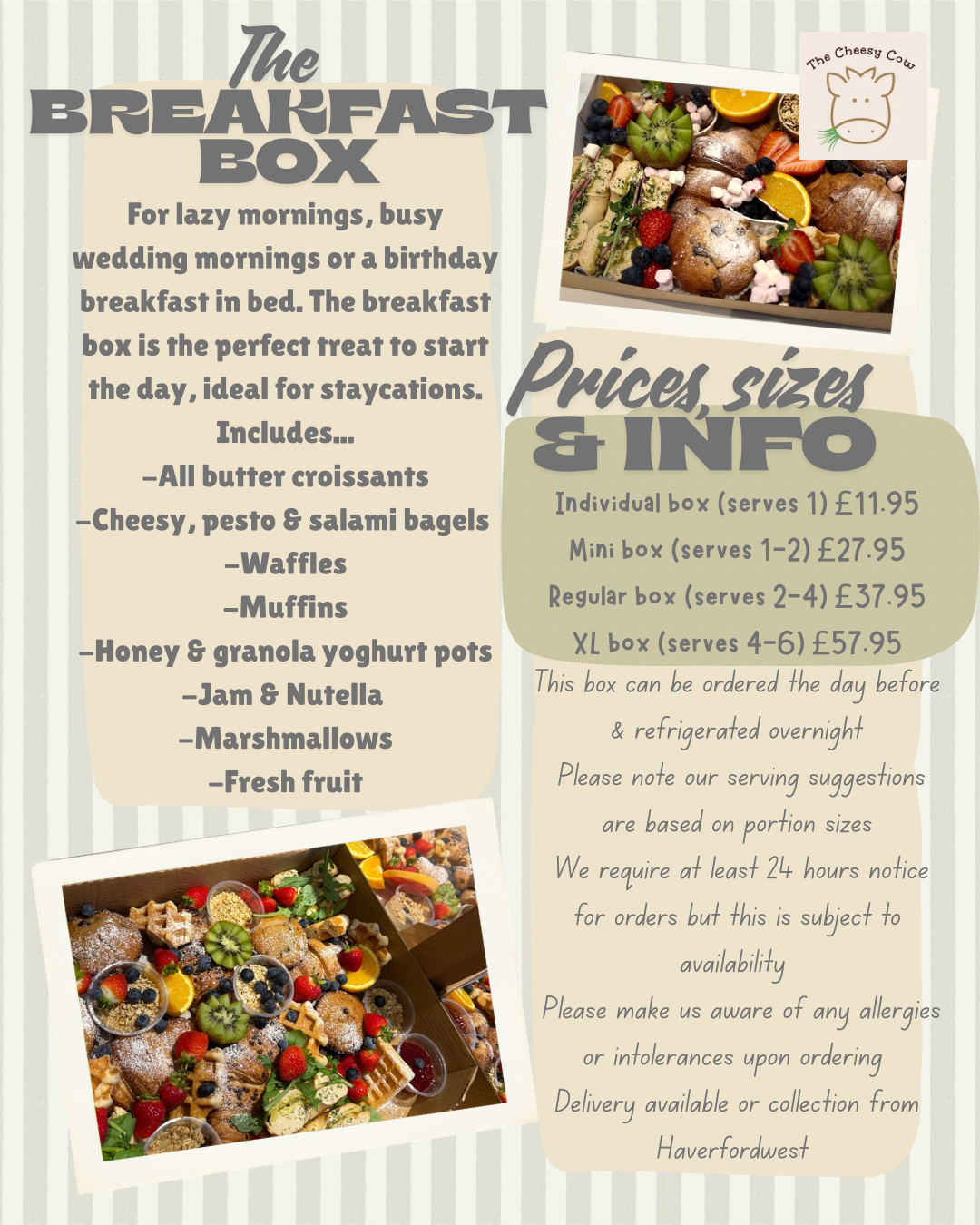This box can be ordered the day before and refrigerated overnight. Perfect for weekend brunches, special occasions, or treating loved ones to breakfast in bed.